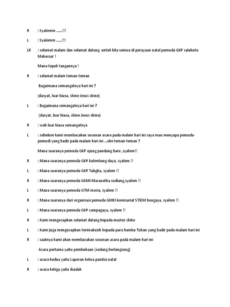 Penjelasan lengkap seputar contoh teks mc formal dan non formal yang baik dan benar. Tidak hanya teks nya saja tapi juga susunan acara pernikahannya secara lengkap susunan random acara pernikahan modern berbahasa indonesia. Demikan sekedar contoh mc pada acara taziah tahlilan namun pada prakteknya agar menyesuaikan dengan kondisi yang ada. Referensi naskah pembawa acara mc untuk acara formal dibutuhkan bagi mereka yang notabene belum pernah menjadi seorang pembawa acara. Susunan acara perayaan natal keluarga toraja. Berikut ini adalah contoh mc dalam acara tahlilan yang biasa berlangsung di tengah masyarakat muslim indonesia. Mohon maaf apabila banyak kesalahan dalam penulisan artikel atau informasi tersebut yang ada kaitannya dengan contoh naskah mc untuk acara natal yang sangat populer. Pidato pj bupati sidoarjo sambutan susunan acara natal 2015. 33%(6)33% found this document useful (6 votes). Contoh susunan acara natal terbaru. Demikian contoh mc/pembawa acara pernikahan walimatu. Contoh naskah teks pembawa acara mc musyawarah pemuda. Sdr(i) yang terkasih dalam tuhan.