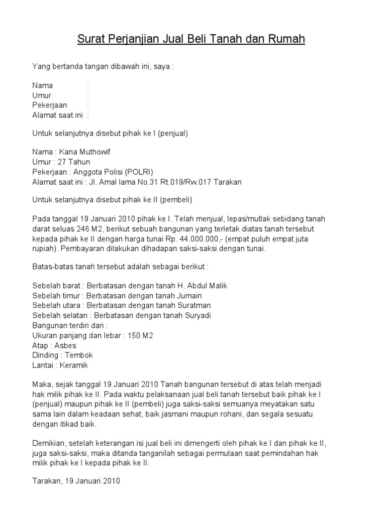 Surat perjanjian jual beli merupakan surat yang dibuat oleh penjual dan pembeli untuk menerangkan atau menjelaskan hak dan kewajiban kedua belah demikianlah yang dapat kami tuliskan tentang contoh surat perjanjian jual beli tanah seperti di atas, pembahasan selanjutnya adalah contoh. Jalan gatot subroto no.34, tangerang barat. #jualbelitanah #aktajualbeli #perjanjianjualbeli contoh surat perjanjian jual beli tanah ini tentunya sangat berguna bagi anda yang hendak menjual maupun. Identitas penjual dan pembeli harus tercantum dengan lengkap seperti dalam contoh surat jual beli tanah ini. Ditambah lagi tidak banyak sumber contoh surat jual beli tanah yang ada baik di internet maupun yang dapat dibeli. Manfaat surat perjanjian jual beli tanah ini bukan hanya dapat melindungi anda sebagai pembeli dari tindak penipuan saja, tapi juga jika anda bertindak sebagai penjual. Surat jual beli tanah berikut ini anda bisa lansung copypaste contoh surat perjanjian jual beli tanah bermaterai ini untuk kelengkapan administrasi anda. Dengan begitu penjual wajib menyerahkan tanah tersebut kepada pembeli dan begitupun sebaliknya, pembeli harus membayar uang senilai tanah tersebut dan berhak mendapatkan tanah tersebut. Intinya surat perjanjian jual beli tanah ini dapat mengantisipasi jika salah satu pihak melakukan wanprestasi (ingkar janji). Sebagai contohnya adalah pada proses jual beli tanah. Identitas tersebut akan dibuktikan dengan fotokopi kartu identitas diri. Untuk lebih jelasnya, lamudi telah menyiapkan contoh surat perjanjian jual beli tanah dalam bentuk pdf dan word doc yang dapat anda gunakan untuk mempermudah proses ketika. Kami yang bertanda tangan di bawah ini: