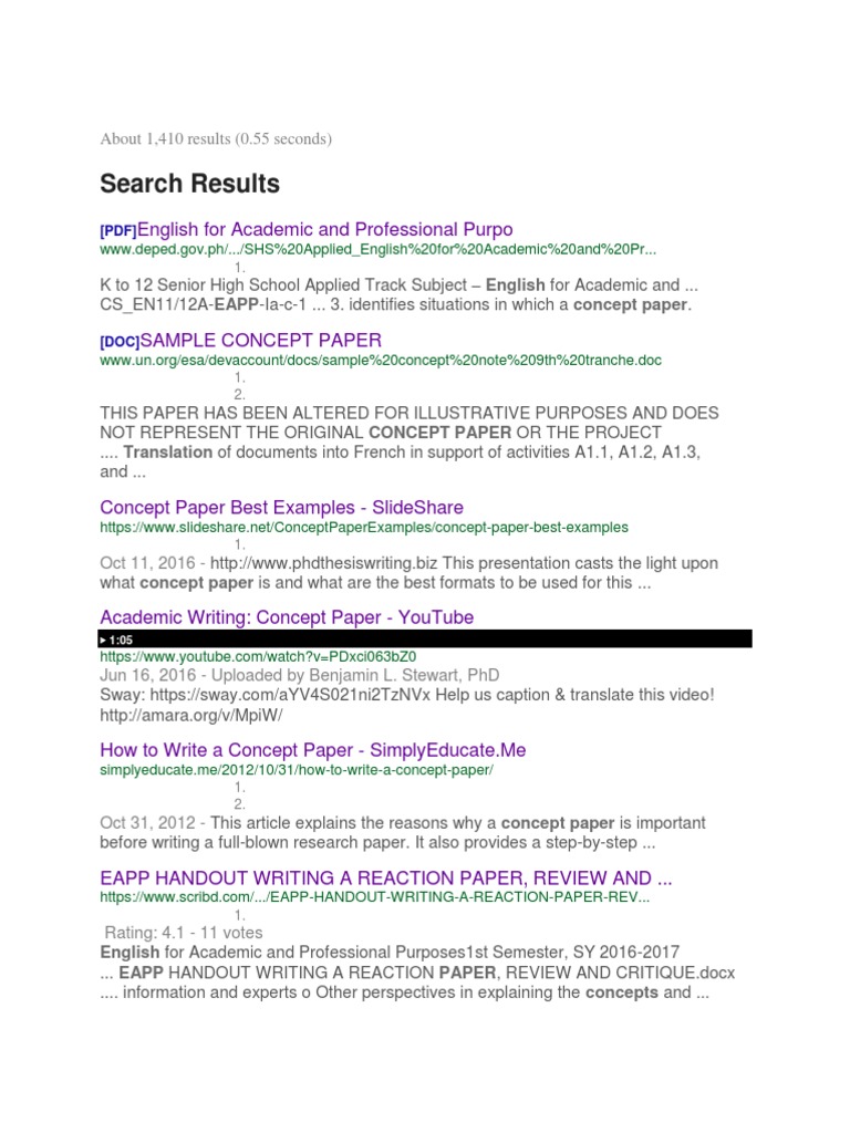 Lesson 10 Concept Paper Eapp Daily from eappdaily.files.wordpress.com For example, a goal might. Preparing a concept paper entails different approaches, but i somehow drew out some principles for example, as a student, you may be asked to prepare your concept paper for your thesis it is not desirable to have a format, as your ideas tend to be limited. The mla format paper example does not define a strict approach to formatting of section headings. Concept paperdefinition of concept paperit is mainly written to clarify a conceptconcept papers are summaries of projects or issues that reflect the interests, experience and expertise of the writer or organizationconcept concept paper eapp. English for academic and professional purposes: A concept paper is a document which summarizes what your project is about, why it is important, and how you intend to carry it out. July 21, 2017, 2:41 a.m. It makes proving a point or arriving at a conclusion easier because you simply have to.